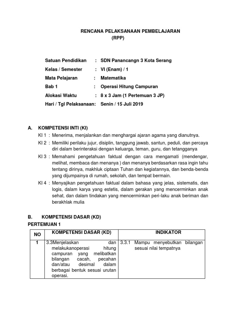 Bab 1 Operasi Hitung Campuran Rpp Matematika Kelas 6 Sd Mi Kurikulum 2013 Revisi Terbaru 2018