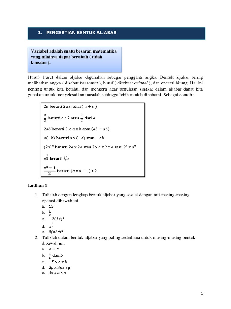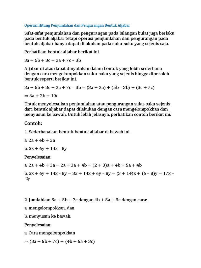 A Operasi Bentuk Aljabar 1 Pengertian Suku Koefisien Bentuk 8x 17 Merupakan Bentuk Aljabar Pdf Document