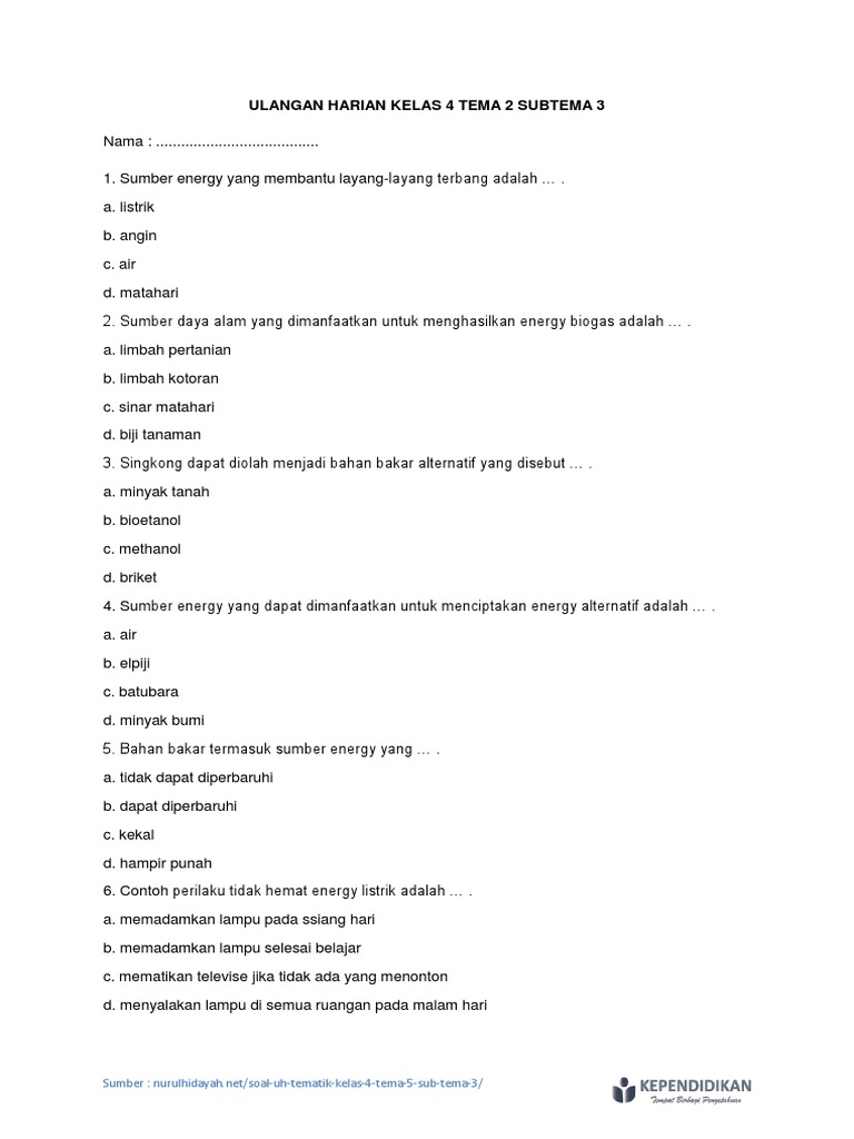 Soal Tematik Kelas 4 Sd Tema 2 Subtema 2 Manfaat Energi Dan Kunci Jawaban Bimbel Brilian