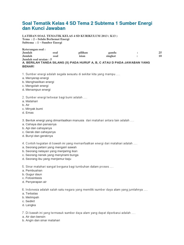 Download Soal Tematik Kelas 4 Semester 1 Tema 2 Subtema 1 Selalu Berhemat Energi Sumber Energi Edisi Terbaru 2018
