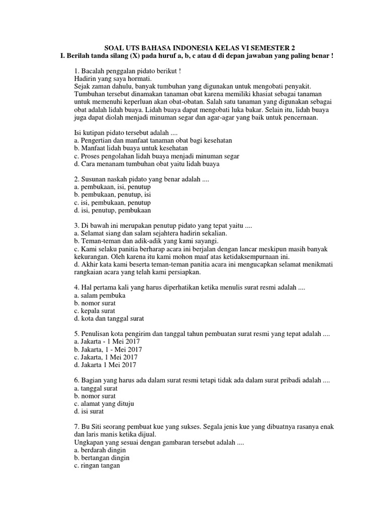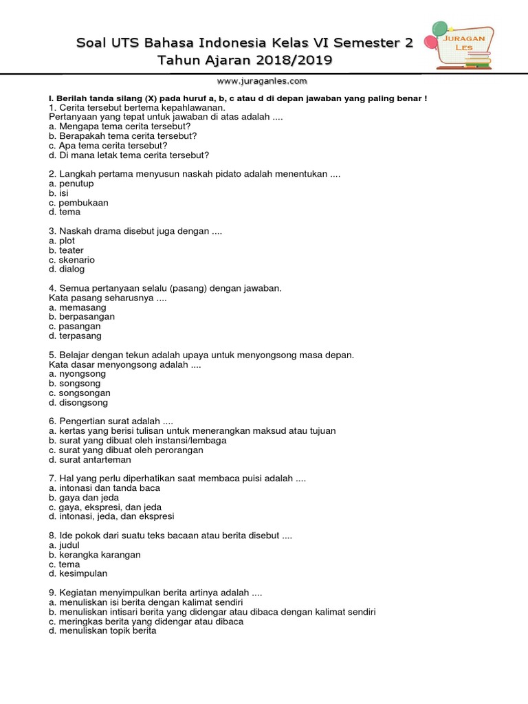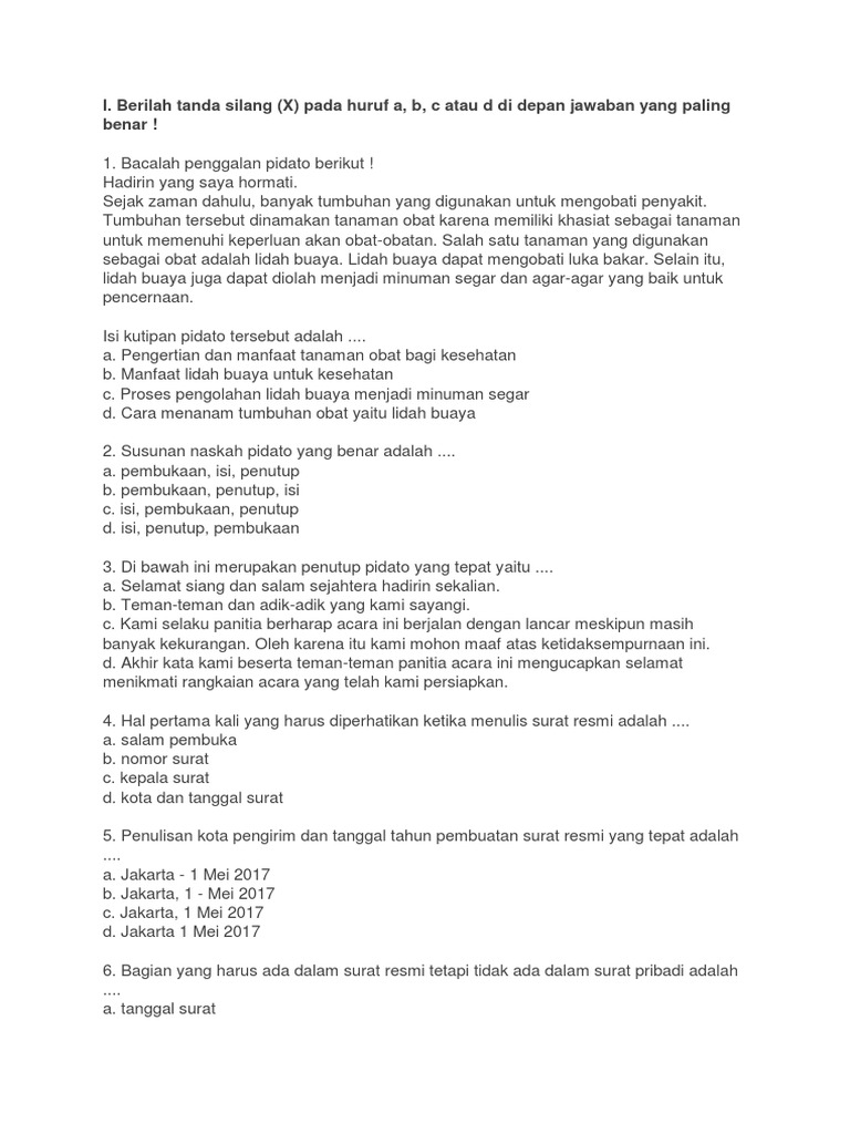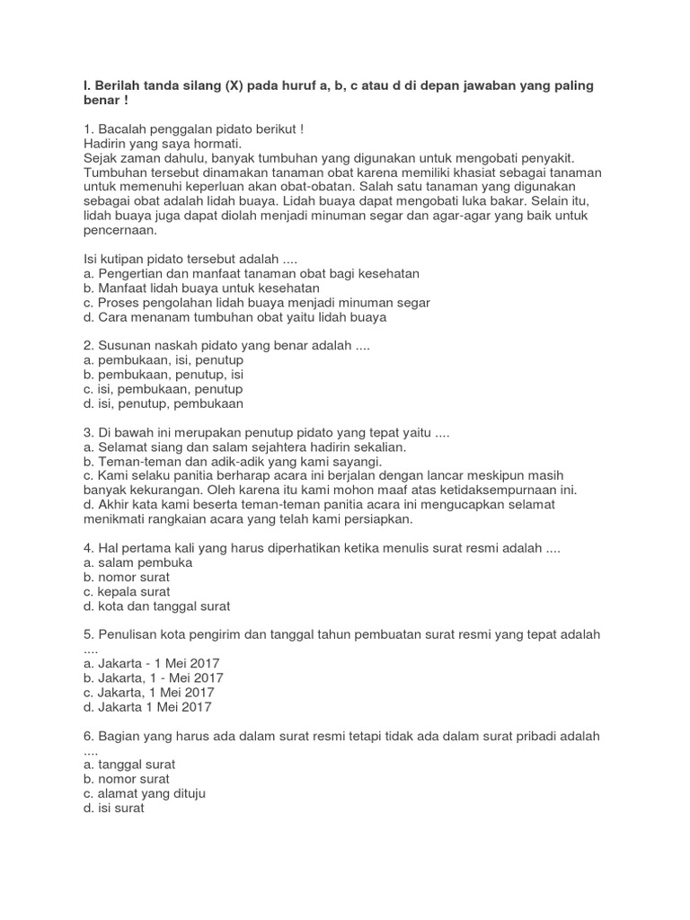I Berilah Tanda Silang X Pada Huruf A B C Atau D Di Depan Jawaban Yang Paling Benar